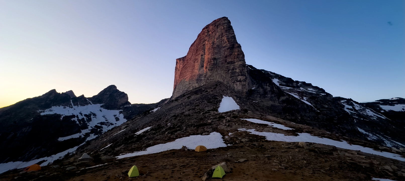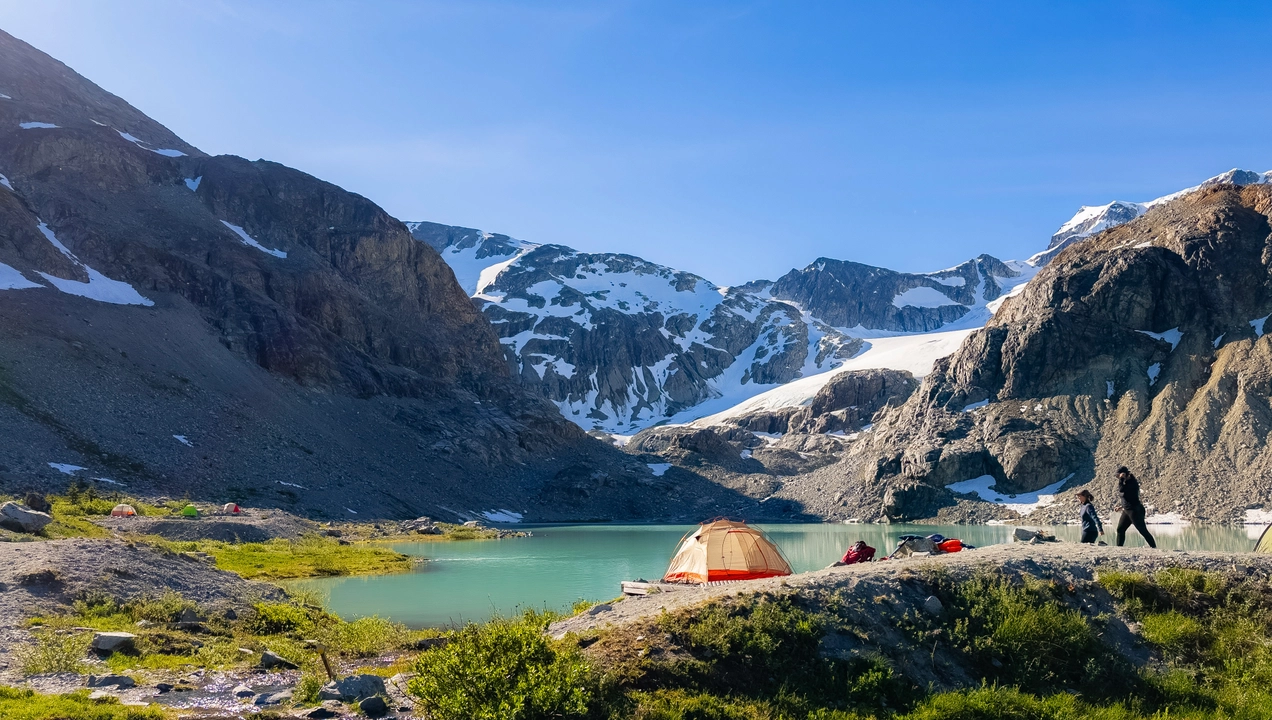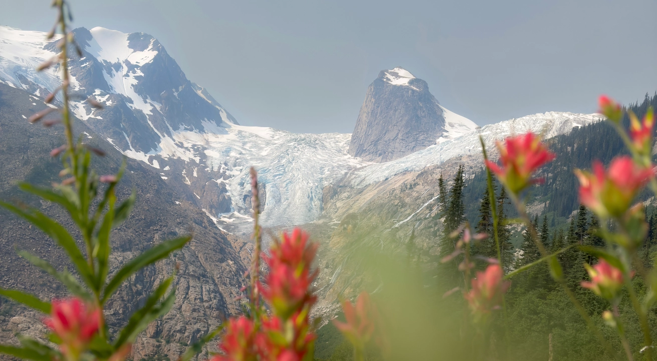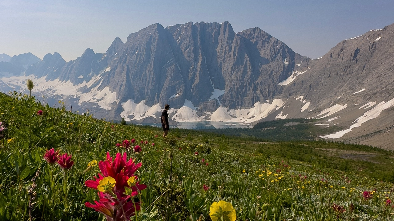 As you make your way upward, the scenery changes rapidly, revealing panoramic views of glaciated peaks, flower-filled slopes, and the striking presence of Jumbo Glacier in the distance. The final stretch to the pass rewards you with a stunning vista of Baldur Mountain and a view of the quaint Jumbo Cabin, perched perfectly on the ridgeline. This high mountain saddle, sitting between two vast valleys, feels remote and pristine, offering an unmatched sense of tranquility and grandeur.