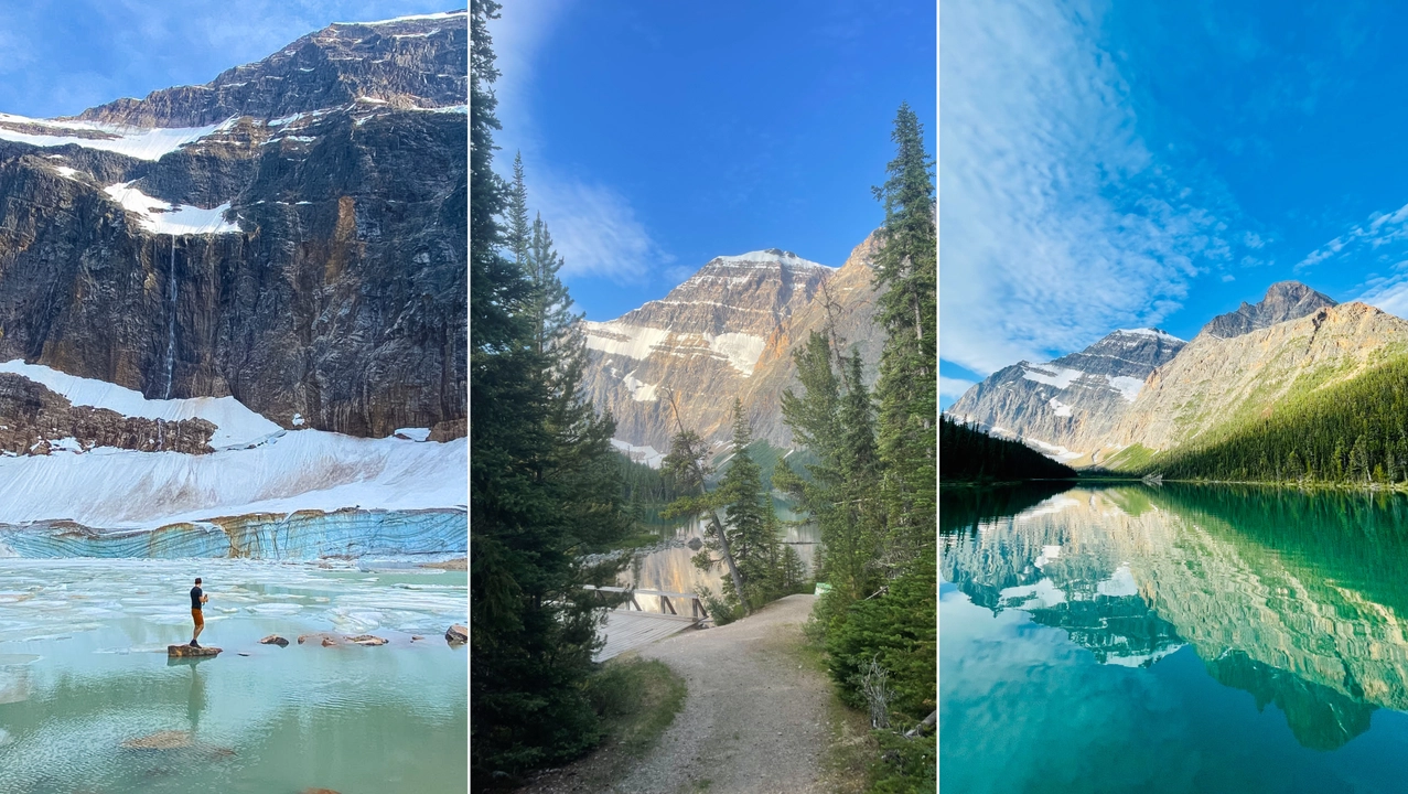 Edith Cavell Lake and Angel Glacier in Jasper National Park are nothing short of magical. Nestled at the foot of Mount Edith Cavell, the lake offers stunning reflections of the surrounding peaks, with the turquoise waters shimmering in the sunlight. But it’s the Angel Glacier that steals the show and its icy fingers cascade down the mountain in a shape that looks like a giant angel’s wing, making it one of the most unique sights in the Rockies. The short hike up to the viewpoint gives you an up-close look at the glacier, and along the way, you’ll be surrounded by towering cliffs, alpine meadows, and the crisp mountain air. It’s a spot that feels untouched by time, offering one of those “wow” moments you’ll remember forever.